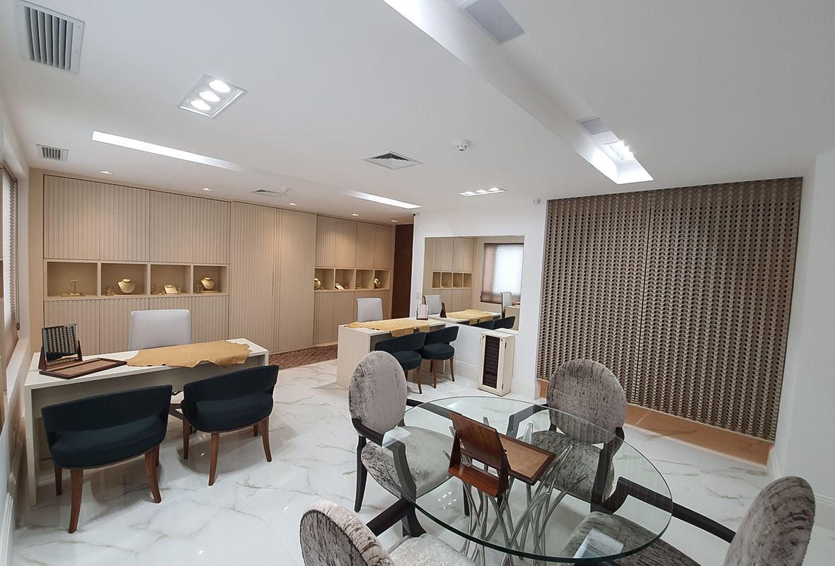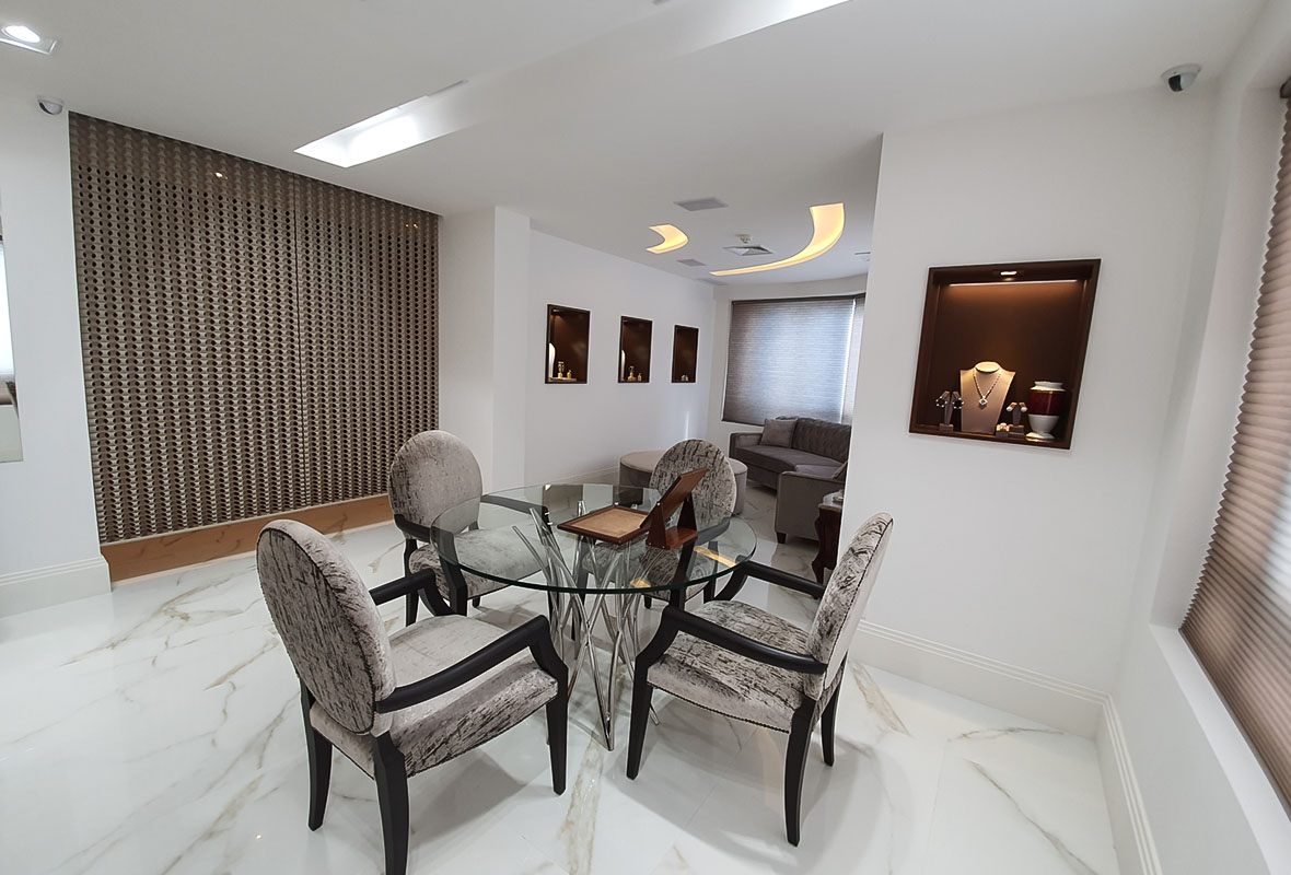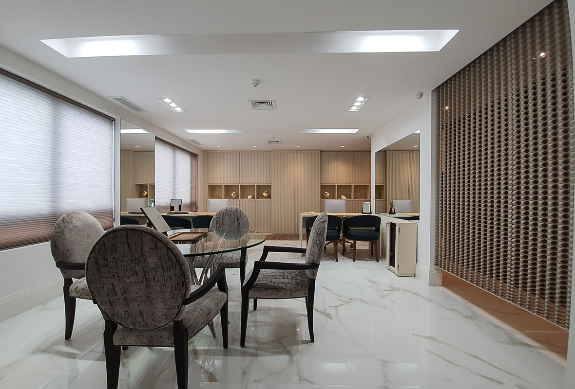 Projeto de arquitetura comercial desenvolvido para a Dassa Danna, com foco na criação de um espaço exclusivo para a experiência da alta joalheria.