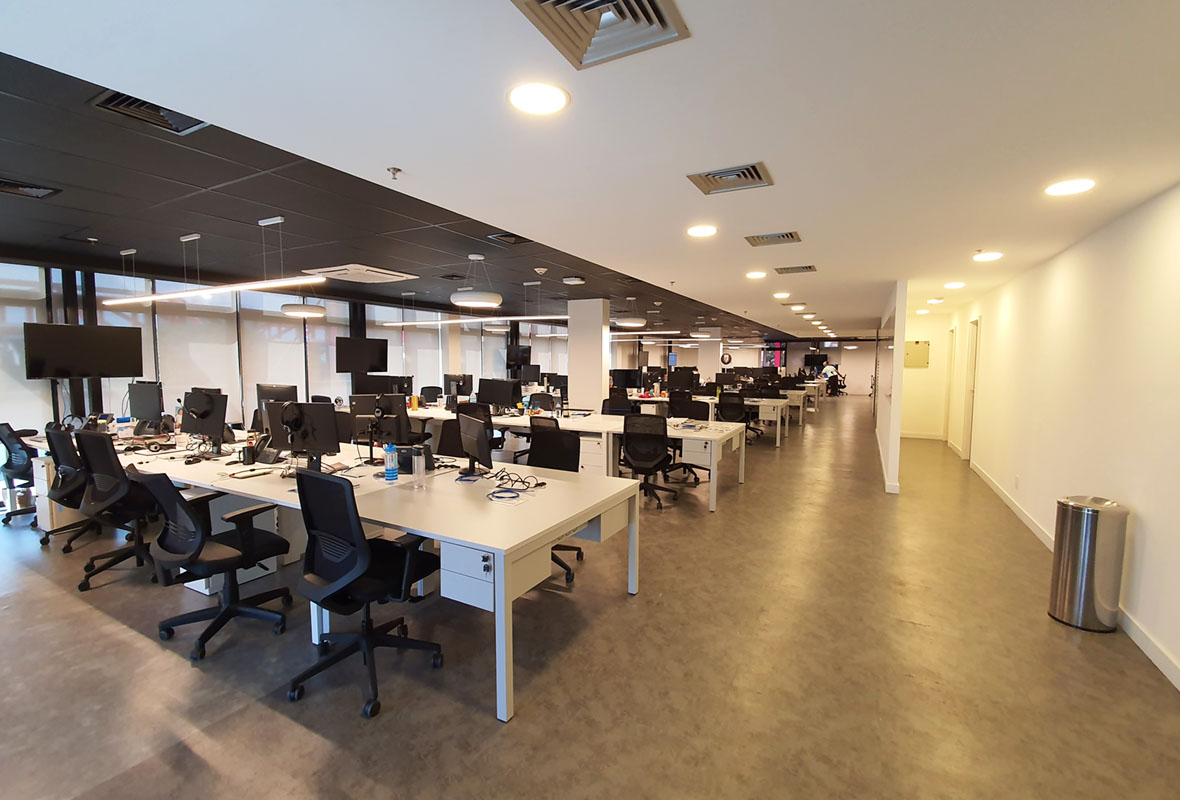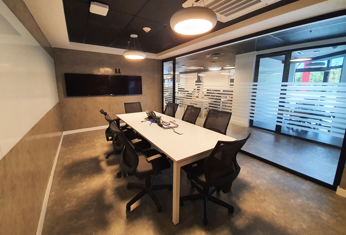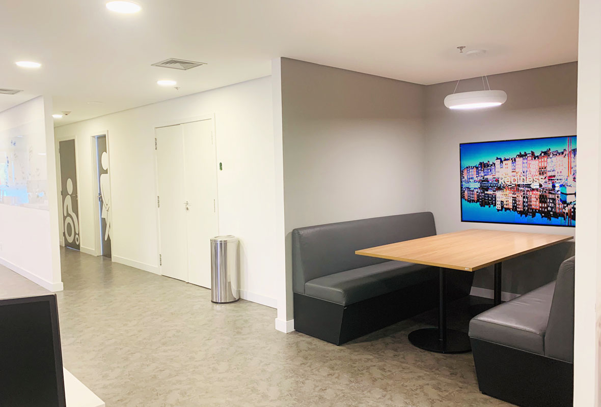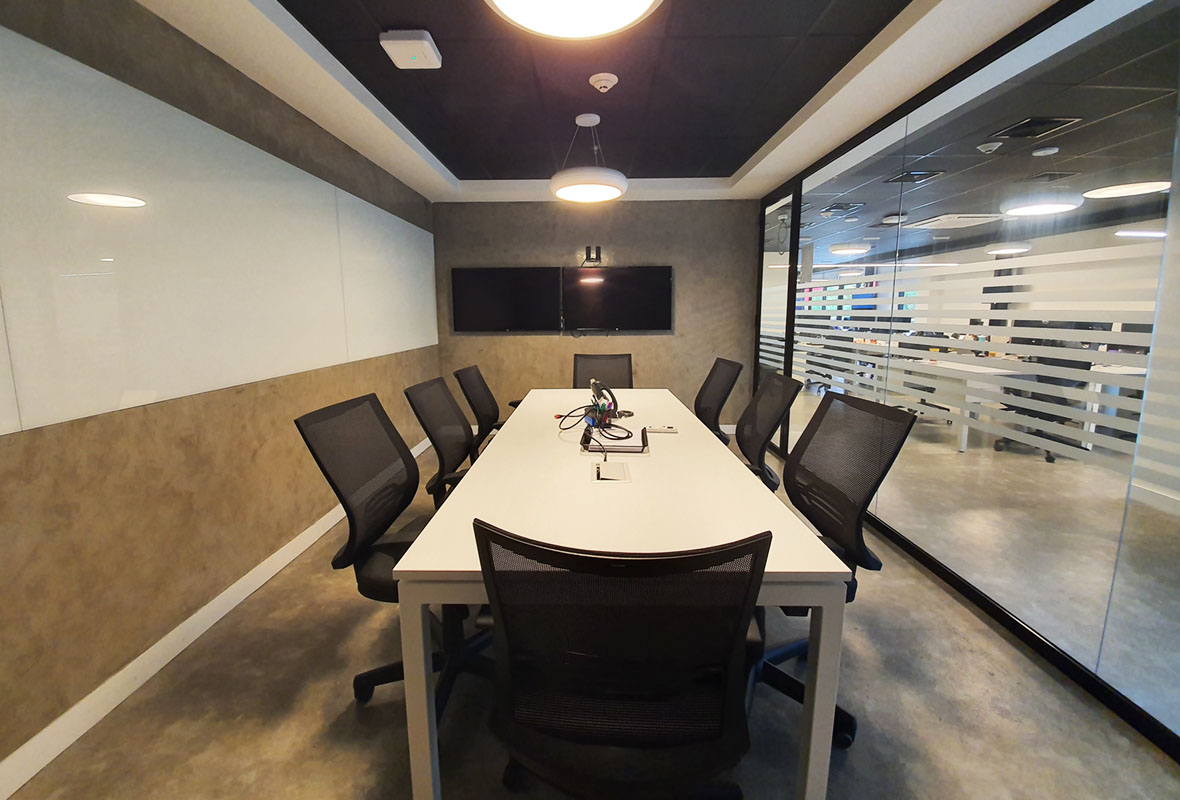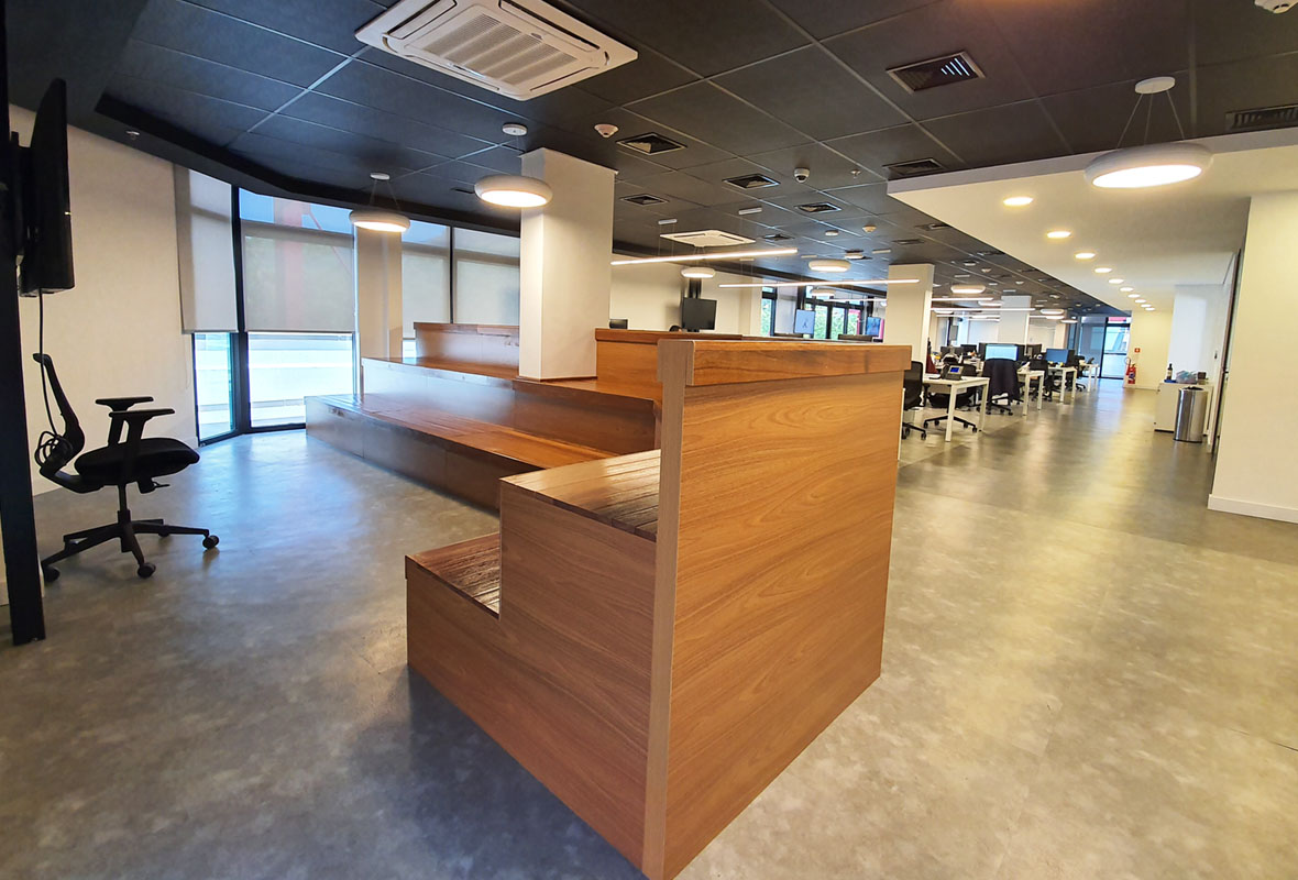 O layout corporativo foi planejado para atender às demandas operacionais da empresa, integrando espaços colaborativos e áreas de reunião de forma eficiente e bem distribuída.