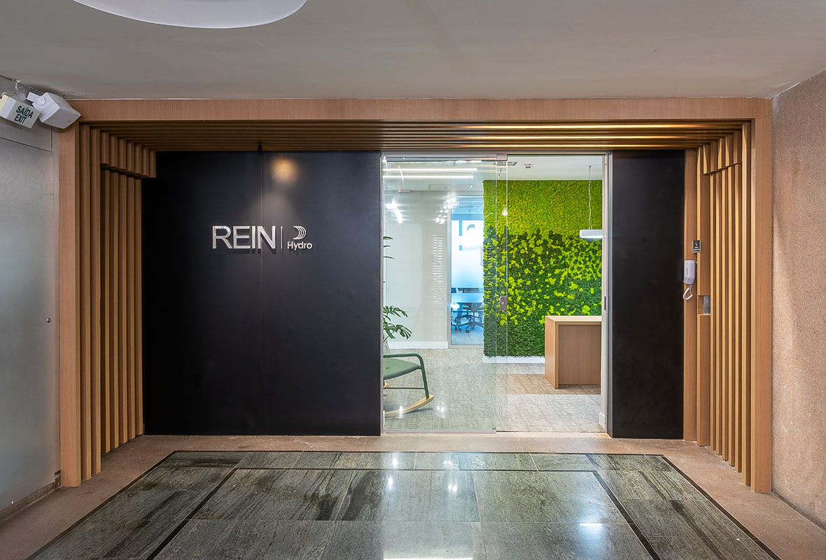O layout corporativo foi desenvolvido para atender às necessidades operacionais da Hidro Rein, garantindo conforto e clareza na distribuição dos ambientes.