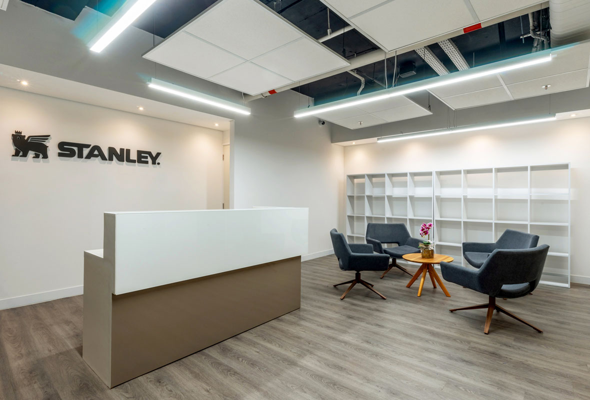 Projeto de arquitetura corporativa desenvolvido para a Stanley, com foco em organização dos espaços, funcionalidade e conforto no ambiente de trabalho.